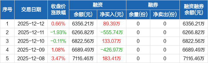 融資方面,當日融資買入1364.11萬元,融資償還1274.71萬元,融資凈買入89.39萬元。融券方面,融券賣出0份,融券償還0份,融券余量0份,融券余額0元。融資融券余額合計6356.21萬元。