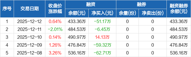 融資方面,當(dāng)日融資買入97.31萬元,融資償還148.48萬元,融資凈償還51.17萬元。融券方面,融券賣出0份,融券償還0份,融券余量0份,融券余額0元。融資融券余額合計(jì)433.36萬元。