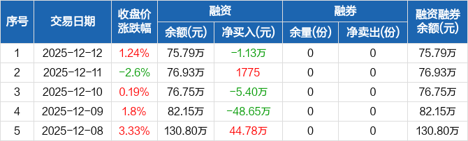 融資方面,當(dāng)日融資買入11.12萬元,融資償還12.25萬元,融資凈償還1.13萬元。融券方面,融券賣出0份,融券償還0份,融券余量0份,融券余額0元。融資融券余額合計(jì)75.79萬元。