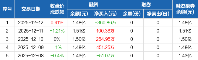 融資方面,當(dāng)日融資買入1155.11萬元,融資償還1515.98萬元,融資凈償還360.86萬元。融券方面,融券賣出0份,融券償還0份,融券余量0份,融券余額0元。融資融券余額合計(jì)1.48億元。