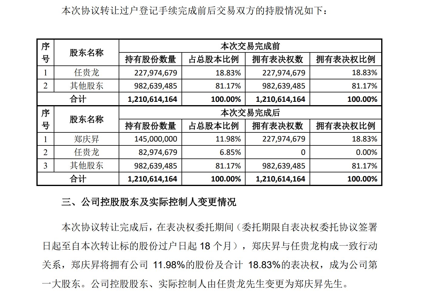 隨著轉(zhuǎn)讓及表決權(quán)委托完成,鄭慶昇擁有金字火腿11.98%的股份及合計(jì)18.83%的表決權(quán),成為公司第一大股東,也成為公司控股股東、實(shí)際控制人。