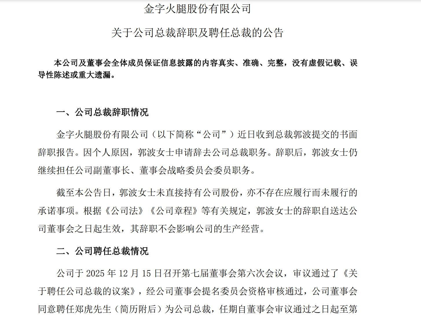 2025年6月,鄭慶昇成為金字火腿(002515)新的實(shí)際控制人。隨后公司換屆鄭慶昇成為公司董事長,私募出身的郭波成為金字火腿副董事長兼總裁。僅僅不到半年后,郭波就宣布辭去總裁職務(wù)。