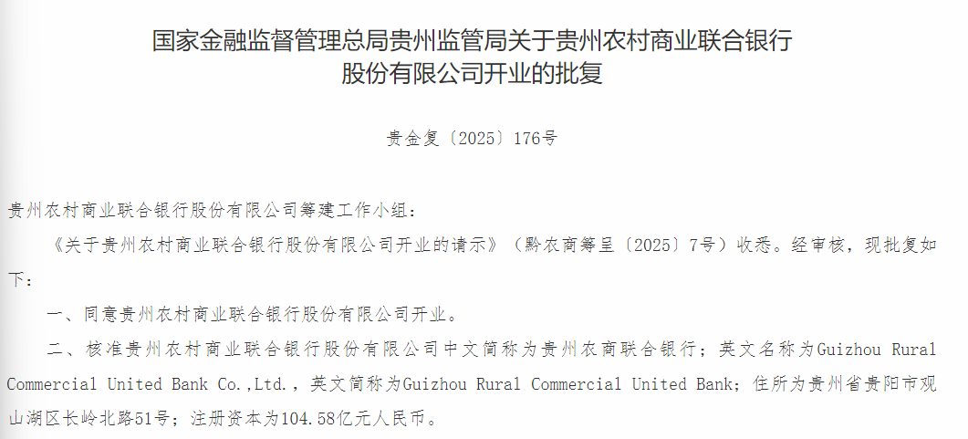 貴州農商聯(lián)合銀行獲批開業(yè)