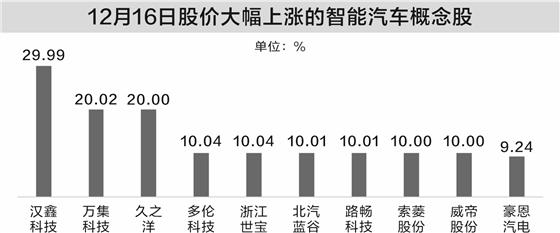 12月16日,A股智能汽車(chē)板塊大幅上漲,漢鑫科技30%漲停,萬(wàn)集科技、浙江世寶、北汽藍(lán)谷、多倫科技、路暢科技、索菱股份等個(gè)股漲停,豪恩汽電、四維圖新、合眾思?jí)?/a>等個(gè)股大幅上漲。