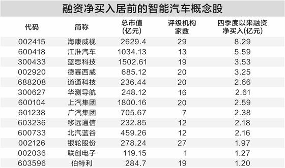 證券時(shí)報(bào)·數(shù)據(jù)寶梳理了今年四季度以來(lái)(截至12月15日),融資資金凈買(mǎi)入額逾1億元的智能汽車(chē)概念股,共計(jì)13只。??低?/a>、江淮汽車(chē)、藍(lán)思科技、德賽西威融資凈買(mǎi)入額居前,依次為8.29億元、5.59億元、3.53億元、3.25億元。