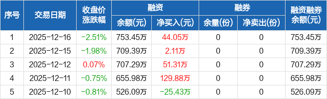 融資方面,當(dāng)日融資買入170.67萬元,融資償還126.61萬元,融資凈買入44.05萬元,連續(xù)4日凈買入累計(jì)227.35萬元。融券方面,融券賣出0份,融券償還0份,融券余量0份,融券余額0元。融資融券余額合計(jì)753.45萬元。