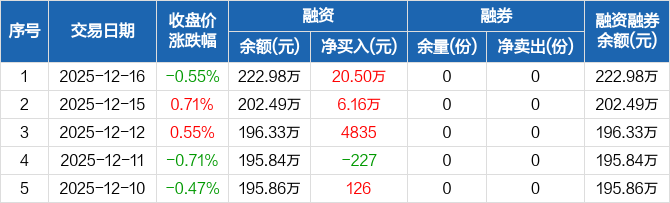 融資方面,當(dāng)日融資買入24.58萬元,融資償還4.09萬元,融資凈買入20.5萬元,連續(xù)3日凈買入累計(jì)27.14萬元。融券方面,融券賣出0份,融券償還0份,融券余量0份,融券余額0元。融資融券余額合計(jì)222.98萬元。