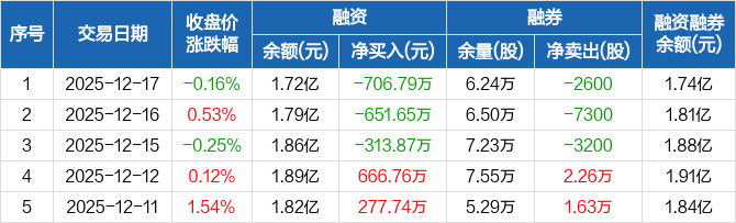 融資方面,當(dāng)日融資買入1295.48萬元,融資償還2002.27萬元,融資凈償還706.79萬元,連續(xù)3日凈償還累計1672.31萬元。融券方面,融券賣出600股,融券償還3200股,融券余量6.24萬股,融券余額152.32萬元。融資融券余額合計1.74億元。