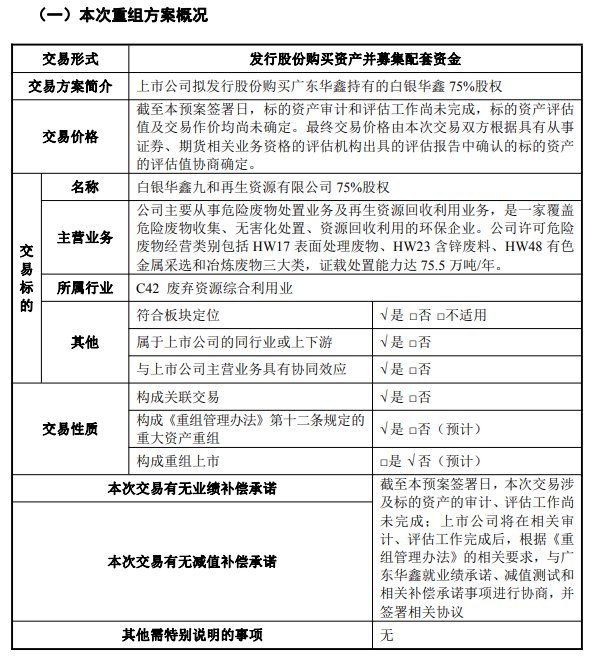 公司本著審慎與投資風(fēng)險可控的原則,擬收購控股股東旗下資源循環(huán)利用企業(yè)白銀華鑫。該公司是一家覆蓋危險廢物收集、無害化處置、資源回收利用的環(huán)保企業(yè),主要產(chǎn)品為處置危廢產(chǎn)生的含鋅、銀、鐵等有價金屬的資源化產(chǎn)品。公司危廢處置資質(zhì)達(dá)75.5萬噸/年,是全國最大的危廢處置單體企業(yè),服務(wù)客戶包括礦山、冶煉、能源等行業(yè),位于上市公司產(chǎn)業(yè)下游。