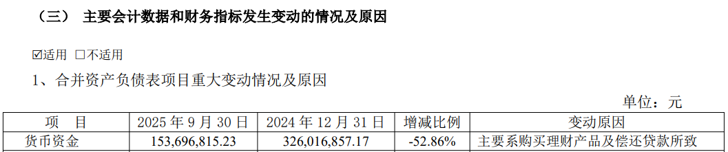 三季報(下圖)顯示,截至今年9月末,公司賬上貨幣資金余額僅1.54億元,較2024年末腰斬,主要系購買理財產(chǎn)品及償還貸款所致。
