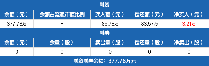 融資方面,當(dāng)日融資買入86.78萬元,融資償還83.57萬元,融資凈買入3.21萬元。融券方面,融券賣出0份,融券償還0份,融券余量0份,融券余額0元。融資融券余額合計(jì)377.78萬元。