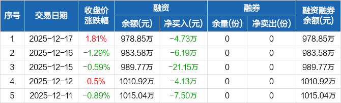 融資方面,當(dāng)日融資買入7.63萬元,融資償還12.36萬元,融資凈償還4.73萬元,連續(xù)7日凈償還累計(jì)55.96萬元。融券方面,融券賣出0份,融券償還0份,融券余量0份,融券余額0元。融資融券余額合計(jì)978.85萬元。