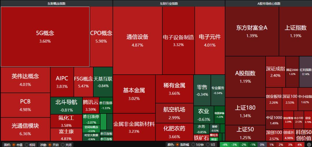 昨日三大指數(shù)集體走強(qiáng),滬指漲1.19%,收報(bào)3870.28點(diǎn);深證成指漲2.40%,收報(bào)13224.51點(diǎn);創(chuàng)業(yè)板指漲3.39%,收報(bào)3175.91點(diǎn)。滬深兩市成交額達(dá)到18111億。行業(yè)板塊多數(shù)收漲,能源金屬、貴金屬、保險(xiǎn)、電池、化肥行業(yè)、有色金屬板塊漲幅居前,裝修裝飾、航天航空板塊跌幅居前。