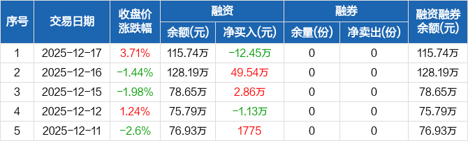 融資方面,當(dāng)日融資買入39.89萬(wàn)元,融資償還52.34萬(wàn)元,融資凈償還12.45萬(wàn)元。融券方面,融券賣出0份,融券償還0份,融券余量0份,融券余額0元。融資融券余額合計(jì)115.74萬(wàn)元。