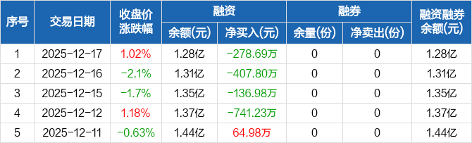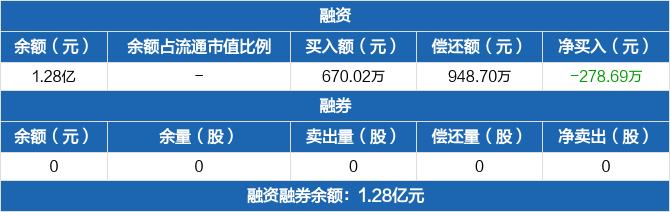 融資方面,當(dāng)日融資買入670.02萬元,融資償還948.7萬元,融資凈償還278.69萬元,連續(xù)4日凈償還累計1564.7萬元。融券方面,融券賣出0份,融券償還0份,融券余量0份,融券余額0元。融資融券余額合計1.28億元。