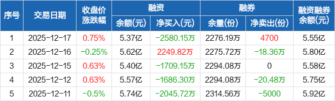 2025年12月17日消費ETF融資凈償還2580.15萬元,融資余額5.37億元