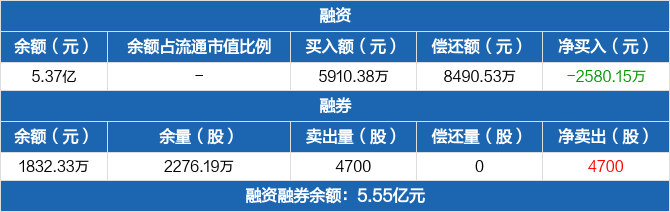 融資方面,當日融資買入5910.38萬元,融資償還8490.53萬元,融資凈償還2580.15萬元。融券方面,融券賣出4700份,融券償還0份,融券余量2276.19萬份,融券余額1832.33萬元。融資融券余額合計5.55億元。