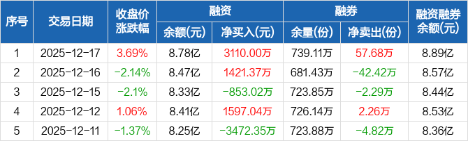 融資方面,當(dāng)日融資買入1.61億元,融資償還1.29億元,融資凈買入3110萬元。融券方面,融券賣出98.19萬份,融券償還40.51萬份,融券余量739.11萬份,融券余額1121.23萬元。融資融券余額合計(jì)8.89億元。