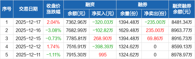 融資方面,當日融資買入885.18萬元,融資償還1205.21萬元,融資凈償還320.03萬元。融券方面,融券賣出0份,融券償還235萬份,融券余量1394.48萬份,融券余額1118.37萬元。融資融券余額合計8481.34萬元。