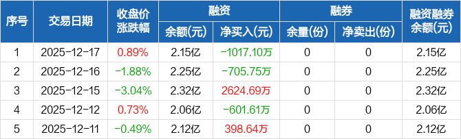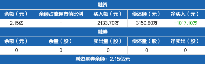 融資方面,當(dāng)日融資買(mǎi)入2133.7萬(wàn)元,融資償還3150.8萬(wàn)元,融資凈償還1017.1萬(wàn)元。融券方面,融券賣(mài)出0份,融券償還0份,融券余量0份,融券余額0元。融資融券余額合計(jì)2.15億元。