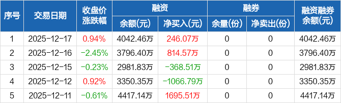 融資方面,當(dāng)日融資買入905.88萬元,融資償還659.82萬元,融資凈買入246.07萬元。融券方面,融券賣出0份,融券償還0份,融券余量0份,融券余額0元。融資融券余額合計(jì)4042.46萬元。
