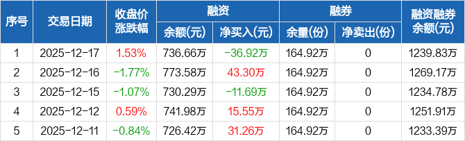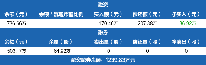 融資方面,當(dāng)日融資買入170.46萬(wàn)元,融資償還207.38萬(wàn)元,融資凈償還36.92萬(wàn)元。融券方面,融券賣出0份,融券償還0份,融券余量164.92萬(wàn)份,融券余額503.17萬(wàn)元。融資融券余額合計(jì)1239.83萬(wàn)元。