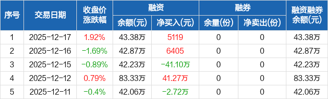 融資方面,當(dāng)日融資買入5.35萬元,融資償還4.84萬元,融資凈買入5119元。融券方面,融券賣出0份,融券償還0份,融券余量0份,融券余額0元。融資融券余額合計43.38萬元。