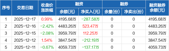 融資方面,當(dāng)日融資買(mǎi)入557.19萬(wàn)元,融資償還844.77萬(wàn)元,融資凈償還287.58萬(wàn)元。融券方面,融券賣(mài)出0份,融券償還0份,融券余量0份,融券余額0元。融資融券余額合計(jì)4195.68萬(wàn)元。