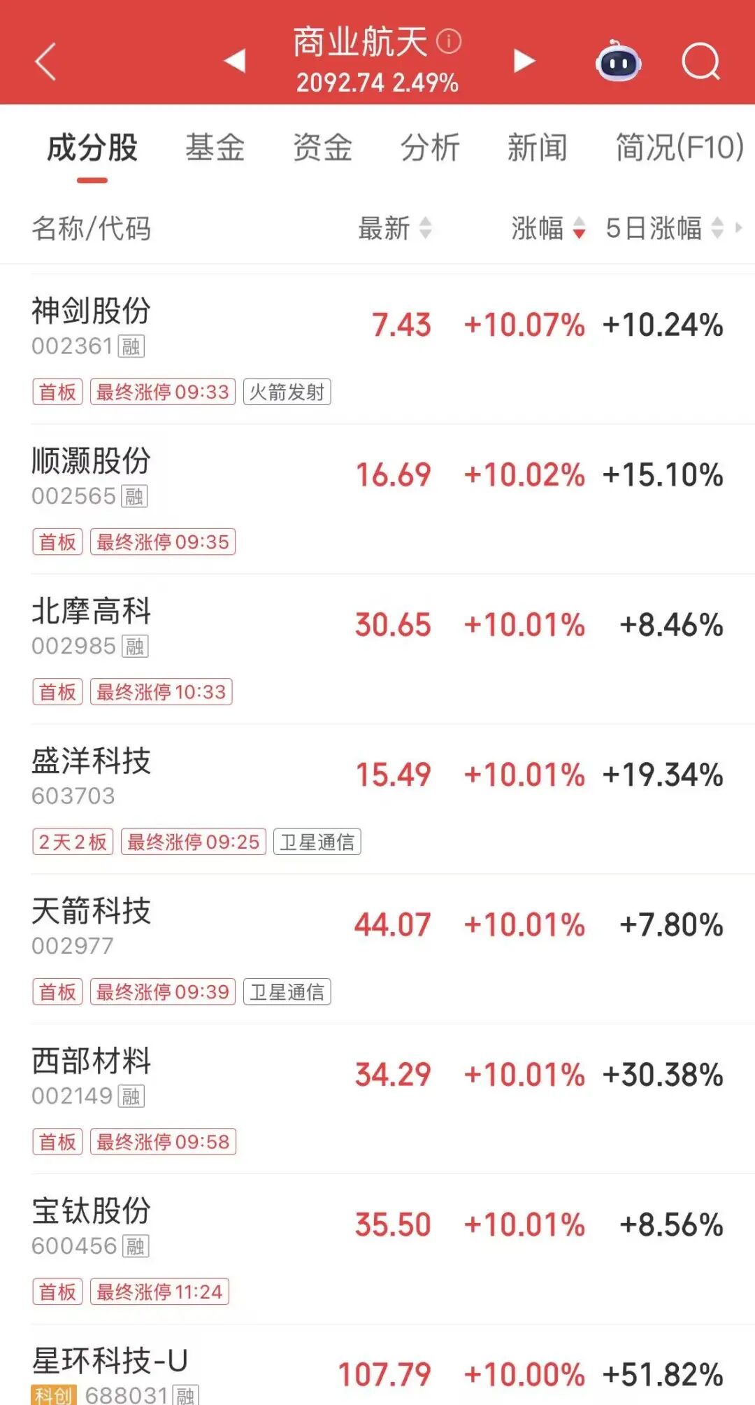 今日早盤,商業(yè)航天概念走勢強勁,中國衛(wèi)星、北摩高科、西部材料、天箭科技等多股漲停。航天環(huán)宇、邵陽液壓、西測測試等漲超10%。消息面上,由中國航天科技集團八院抓總研制的長征十二號甲可重復(fù)使用運載火箭,計劃于2025年12月中下旬在酒泉衛(wèi)星發(fā)射中心執(zhí)行其歷史性的首次發(fā)射任務(wù)。