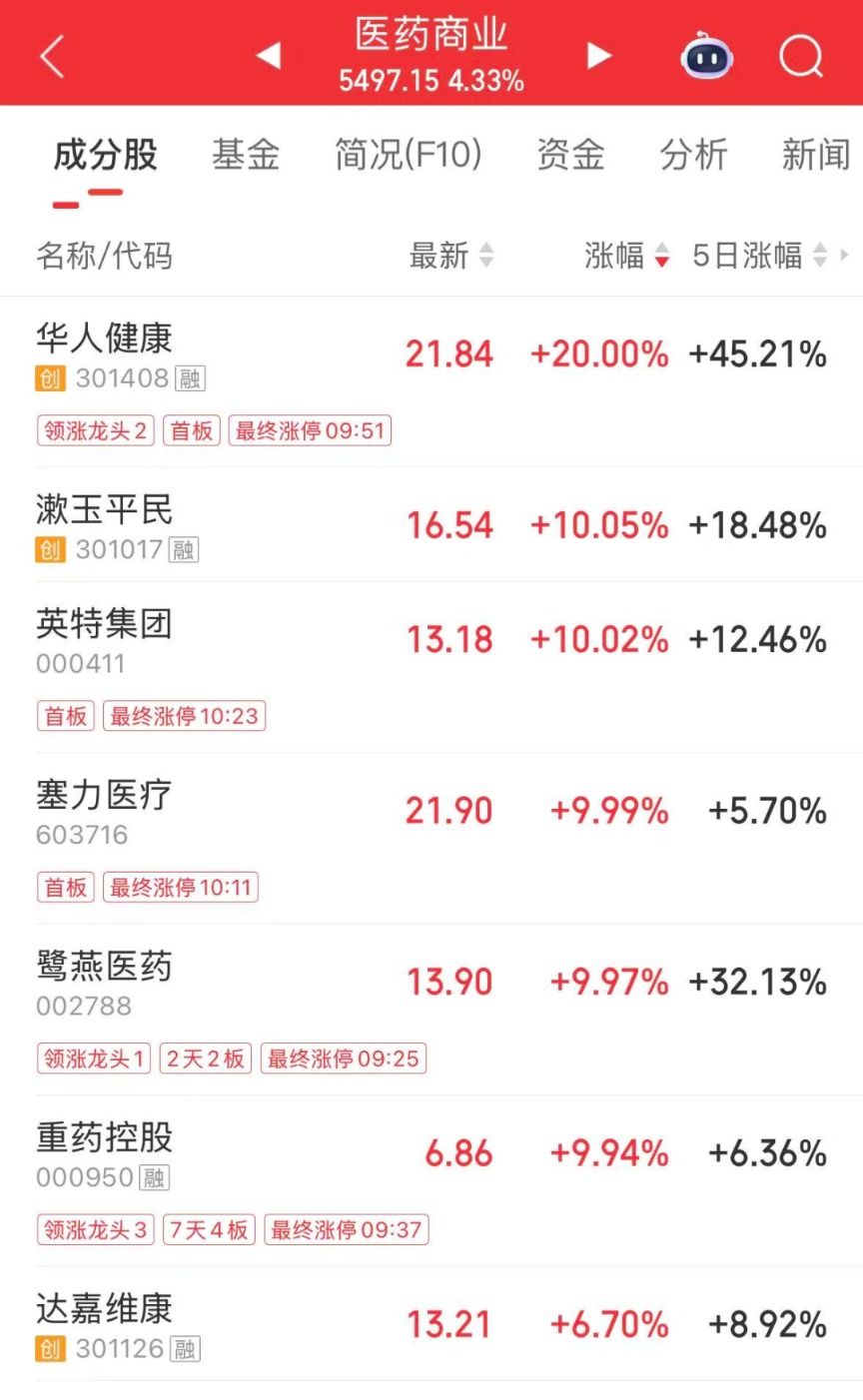 醫(yī)藥商業(yè)、醫(yī)療器械、腦機接口等方向也逆勢走強,華人健康、英特集團、塞力醫(yī)療等多股漲停。成都華微、奕瑞科技、福瑞醫(yī)科、美好醫(yī)療、金域醫(yī)學(xué)等跟漲。