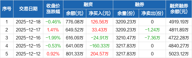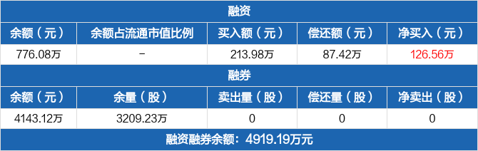 融資方面,當(dāng)日融資買入213.98萬(wàn)元,融資償還87.42萬(wàn)元,融資凈買入126.56萬(wàn)元。融券方面,融券賣出0份,融券償還0份,融券余量3209.23萬(wàn)份,融券余額4143.12萬(wàn)元。融資融券余額合計(jì)4919.19萬(wàn)元。