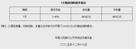 12月18日,中國(guó)人民銀行發(fā)布公告,2025年12月18日中國(guó)人民銀行以固定利率、數(shù)量招標(biāo)方式開(kāi)展了883億元7天期逆回購(gòu)操作,中標(biāo)利率為1.40%,中標(biāo)量為883億元。同時(shí),以固定數(shù)量、利率招標(biāo)、多重價(jià)位中標(biāo)方式開(kāi)展了1000億元14天期逆回購(gòu)操作。今日有1186億元7天期逆回購(gòu)到期,當(dāng)日實(shí)現(xiàn)凈投放697億元。