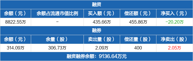 融資方面,當日融資買入435.66萬元,融資償還455.86萬元,融資凈償還20.2萬元。融券方面,融券賣出2.09萬份,融券償還400份,融券余量306.73萬份,融券余額314.09萬元。融資融券余額合計9136.64萬元。