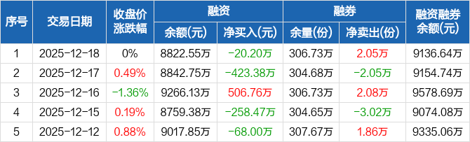 電力ETF融資融券信息顯示,2025年12月18日融資凈償還20.2萬元;融資余額8822.55萬元,較前一日下降0.23%