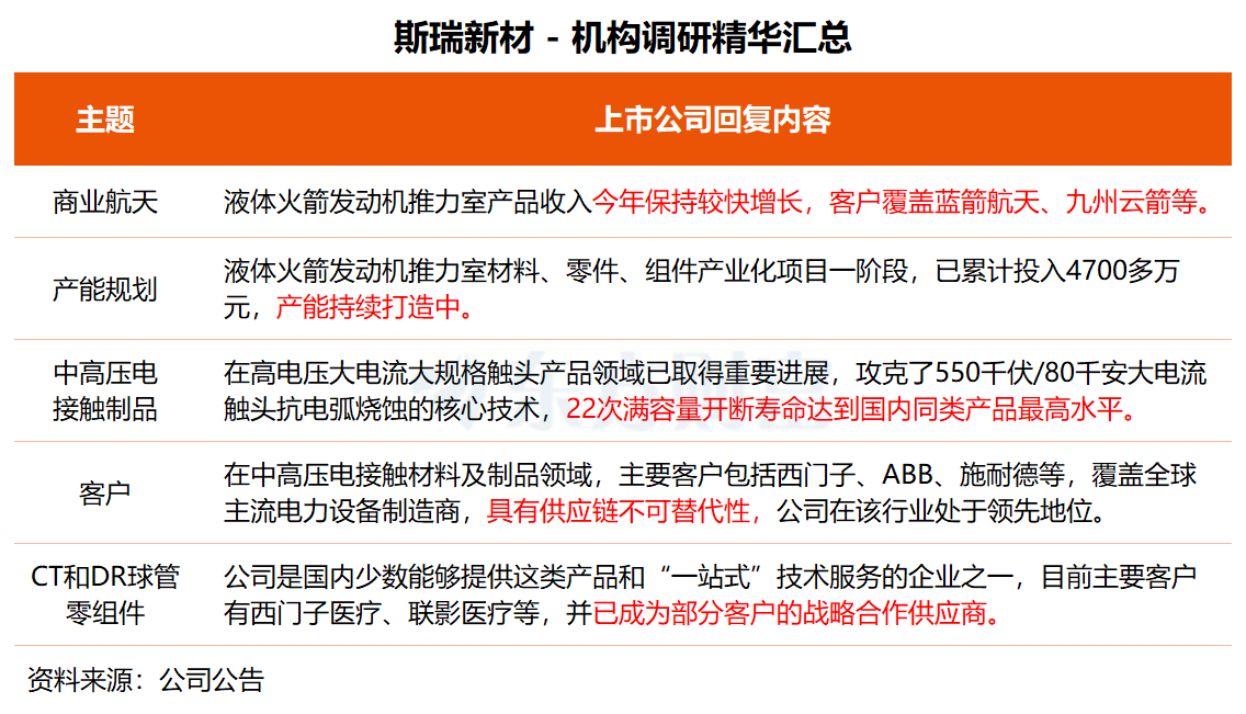 華龍證券此前研報指出,隨著我國商業(yè)航天產(chǎn)業(yè)化加速落地,斯瑞新材作為藍(lán)箭航天核心供應(yīng)商,有望直接受益,相關(guān)業(yè)務(wù)維持高速增長。