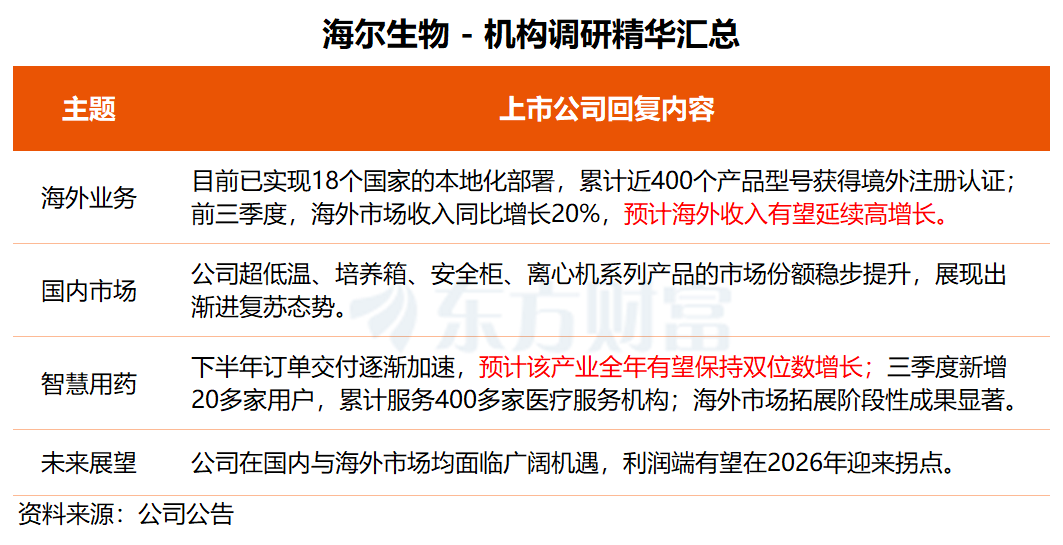 海爾生物近日接受易方達(dá)基金、興業(yè)證券等6家機(jī)構(gòu)調(diào)研,公司在交流中表示,作為國內(nèi)醫(yī)藥生物行業(yè)較早出海的企業(yè),公司已實現(xiàn)18個國家的本地化部署,累計近400個產(chǎn)品型號獲得境外注冊認(rèn)證。未來,公司將加快各產(chǎn)業(yè)產(chǎn)品的本地化注冊認(rèn)證進(jìn)程,預(yù)計海外收入有望延續(xù)高增長。