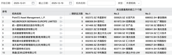 外資機構方面,被稱為華爾街“最瘋狂賺錢機器”的Point72依舊是調研“勞模”,12月以來調研總次數(shù)位居前列。今年以來,該機構調研總次數(shù)排名第一,達261次。