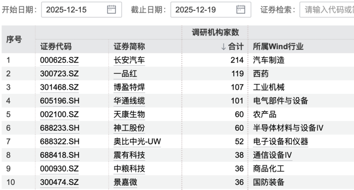 本周(12月15日—12月19日)長安汽車調研機構家數(shù)最多,達214家,機構調研諸多問題指向長安汽車獲得首批L3準入情況。